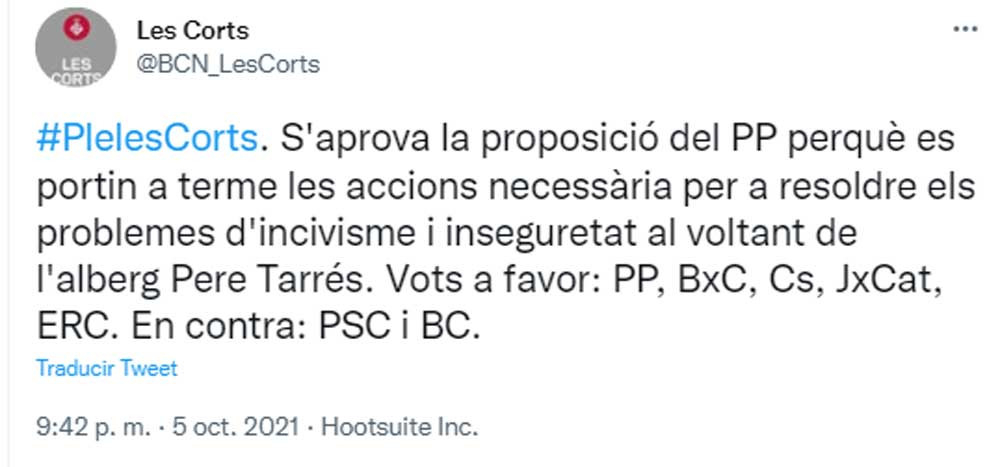 Votación en el Pleno de Les Corts del pasado 6 de octubre sobre la inseguridad e incivismo del entorno de la Fundación Pere Tarrés / @BCN_LesCorts (TWITTER)