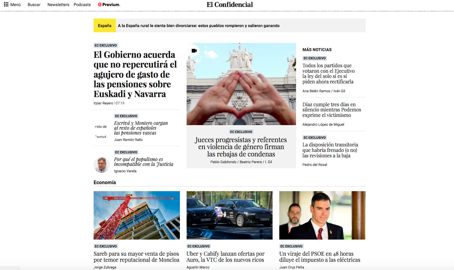 En El País dan por sentado en el titular principal de la portada que "El Supremo se dispone a resolver por la vía rápida sobre la 'ley del sí es sí'". Muy tranquilizador. O no, pues ya se sabe que los jueces son buenos o malos a conveniencia. Escribe Reyes Rincón: "La intervención del Tribunal Supremo en el embrollo jurídico derivado de las rebajas de penas a agresores sexuales tras la ley del solo sí es sí se producirá en las próximas semanas, probablemente antes de fin de mes, según fuentes jurídicas. La Sala de lo Penal tiene que resolver recursos presentados por condenados por delitos sexuales que harán que se pronuncie. El criterio del Supremo marcará el camino a los tribunales superiores y audiencias provinciales, y puede suponer, en algunos casos, que se reviertan resoluciones dictadas en los últimos días. Las peticiones de revisión de condena se suceden por decenas en España: solo en una sección de la Audiencia Provincial de Madrid son más de 40. Ayer se confirmaron al menos 13 rebajas de penas a agresores sexuales de las que tres implicaron la excarcelación".