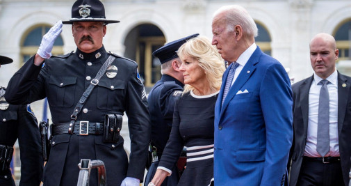 El presidente de los Estados Unidos, Joe Biden, y la primera dama, Jill Biden, llegaron a una ceremonia para honrar a los agentes de la ley que perdieron la vida en el cumplimiento del deber en 2021. El acto se realizó con el Servicio Conmemorativo de los Oficiales Nacionales de la Paz en el Capitolio de EEUU en Washington, DC.
