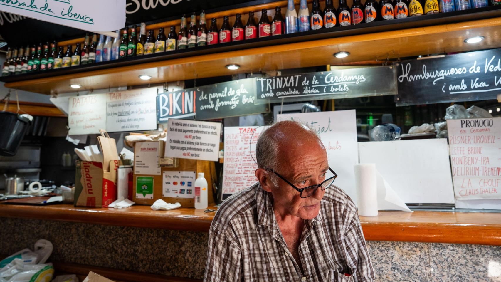 Francesc Pujadó tiene 69 años y sigue trabajando, solo, en la hamburguesería Niu, a la espera de poder traspasar el negocio por un precio digno