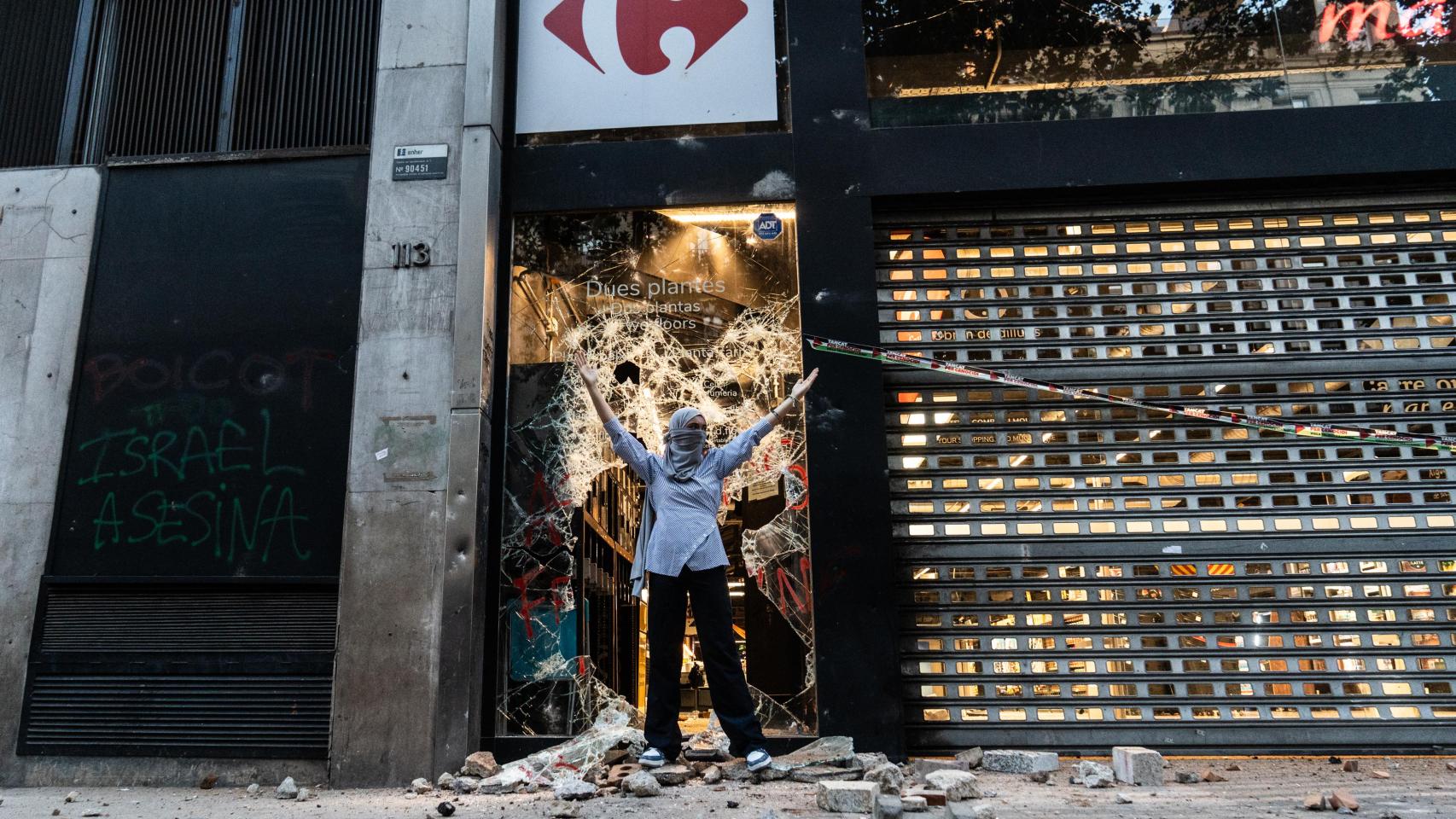 Un manifestante propalestino, atacando el Burger King de calle Tarragona durante los disturbios del pasado octubre en Barcelona